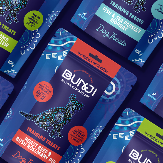 The brand is proudly Indigenous owned, inspired by the word bunji which means mate or friend in several Aboriginal languages. Our packaging direction celebrates the deep bond between humans and their dogs while honouring land, culture and community.